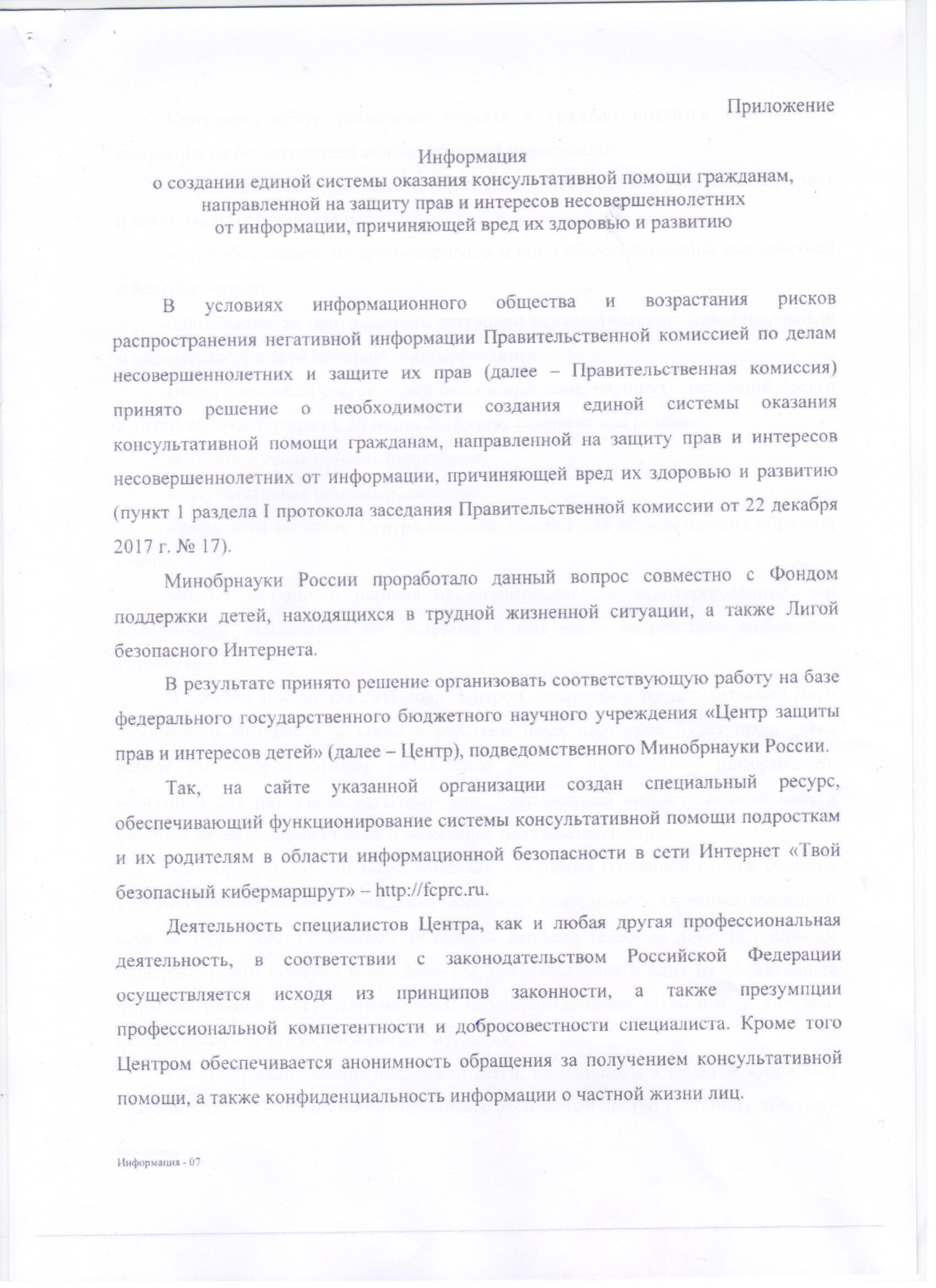 В целях защиты несовершеннолетних от негативных явлений в сети «Интернет» создана «Горячая линия: Твой безопасный кибермаршрут», о возможности получения консультативной помощи в области информационной безопасности в сети «Интернет»